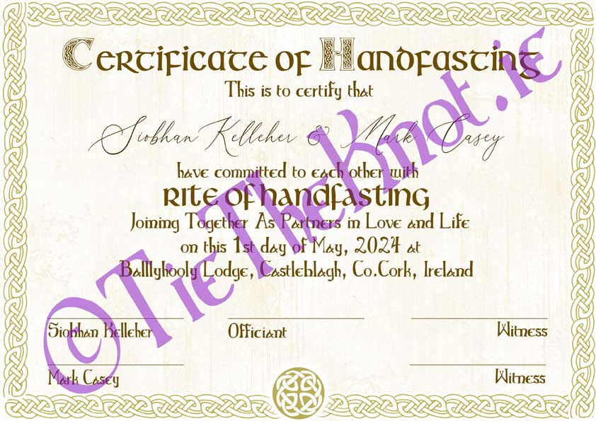 Our gorgeous vintage Celtic design handfasting certificate personalised with your very own details. Perfect to frame with your handfasting chord, your favourite wedding photo and other mementos of your big day in a memorabilia frame made by your local picture framer.